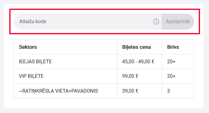 Ja Jums ir atlaižu kods, ievadiet kodu laukumā "Atlaižu kods" un nospiediet pogu “Apstiprināt”. ( NB! 'Atlaižu kods' NAV paredzēts Biļešu Serviss dāvanu biļetes izmantošanai. Dāvanu biļešu kodu iespējams ievadīt iegādes pēdējā solī "Maksājuma veids".)